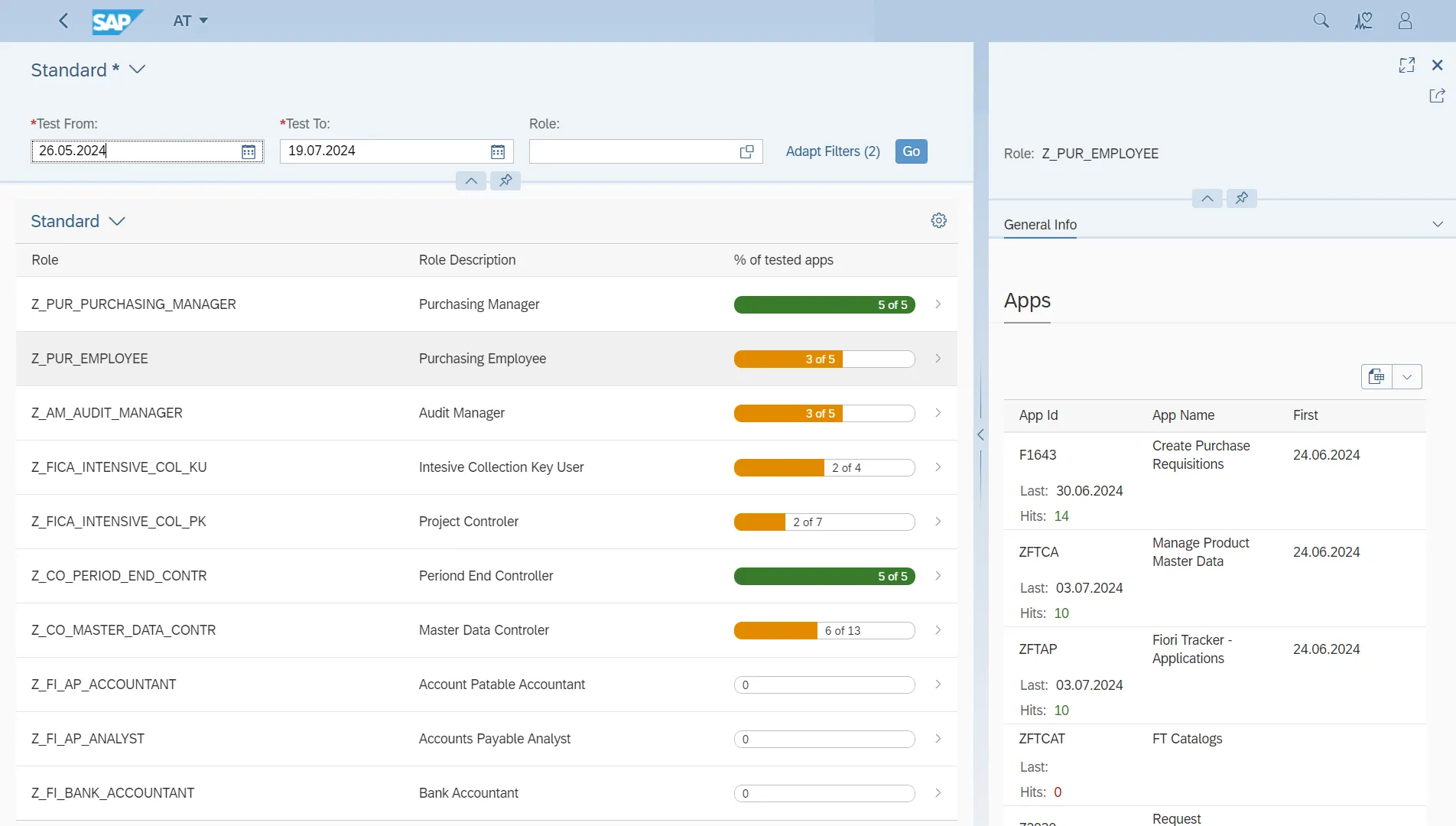 Fiori Role Testing tracks role testing to ensure the team tests all SAP Fiori applications before production deployment. It uses Fiori App Usage to log each app's start, confirming it has been tested.